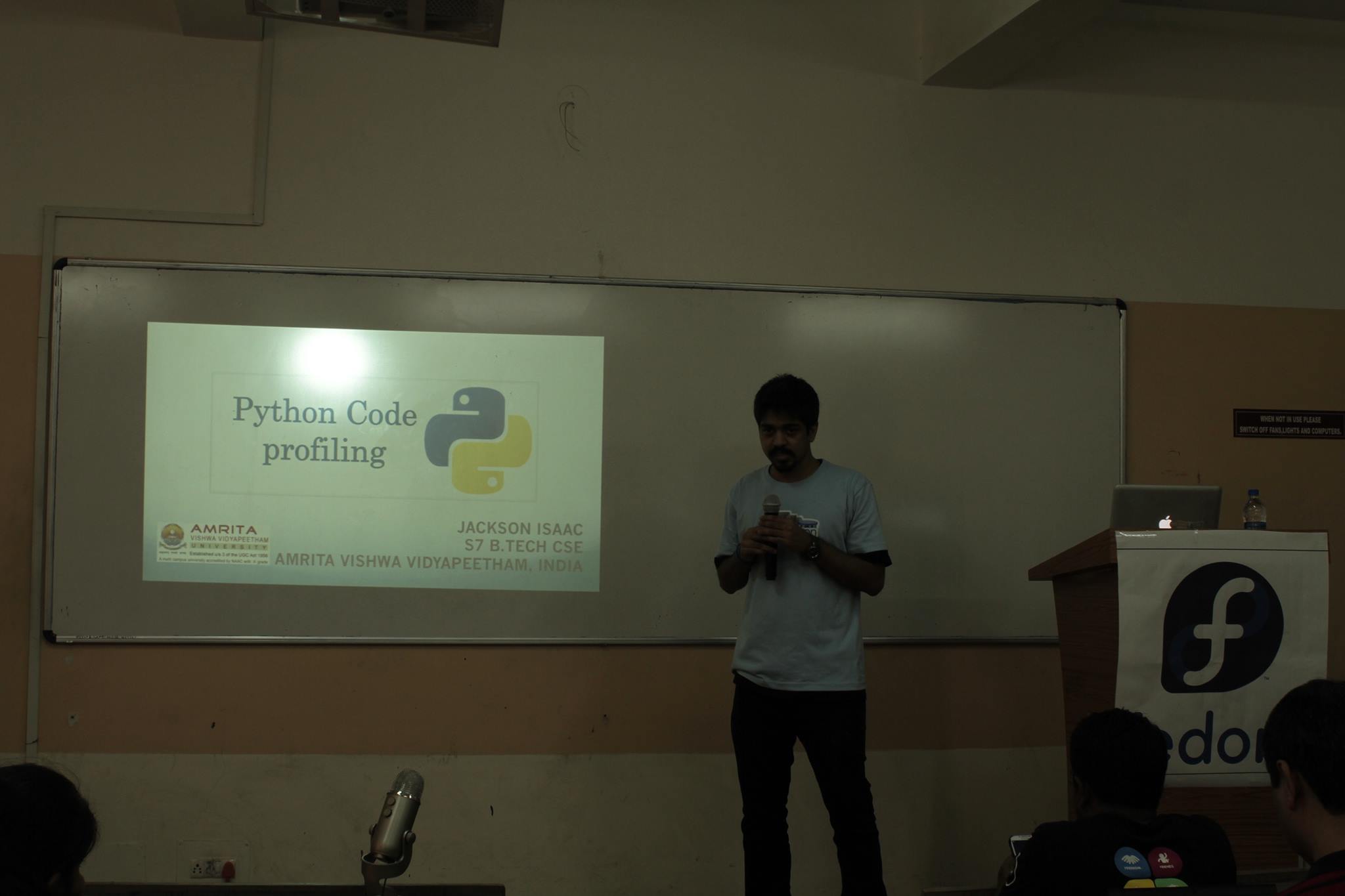 My session began at 2.40 P.M. in the afternoon, and inspite of being sleepy after good food, a good amount of attendees were present for my talk. I kept the talking part short and I focused more on live demo. It was a great interactive session, all the participants were excited to know about line_profiler, profiling and testing their code. They wanted to know more about line_profiler and how they can use it in different scenarios. I made sure that they understood it properly by demonstrating it, as testing is one of the important step in software development. Having written some generic code helped a lot. Participants who had a laptop were along with me following the steps as I went through each step from fetching the source, building and installing, running the profiler and I really felt good that the topic is getting great response from the participants.