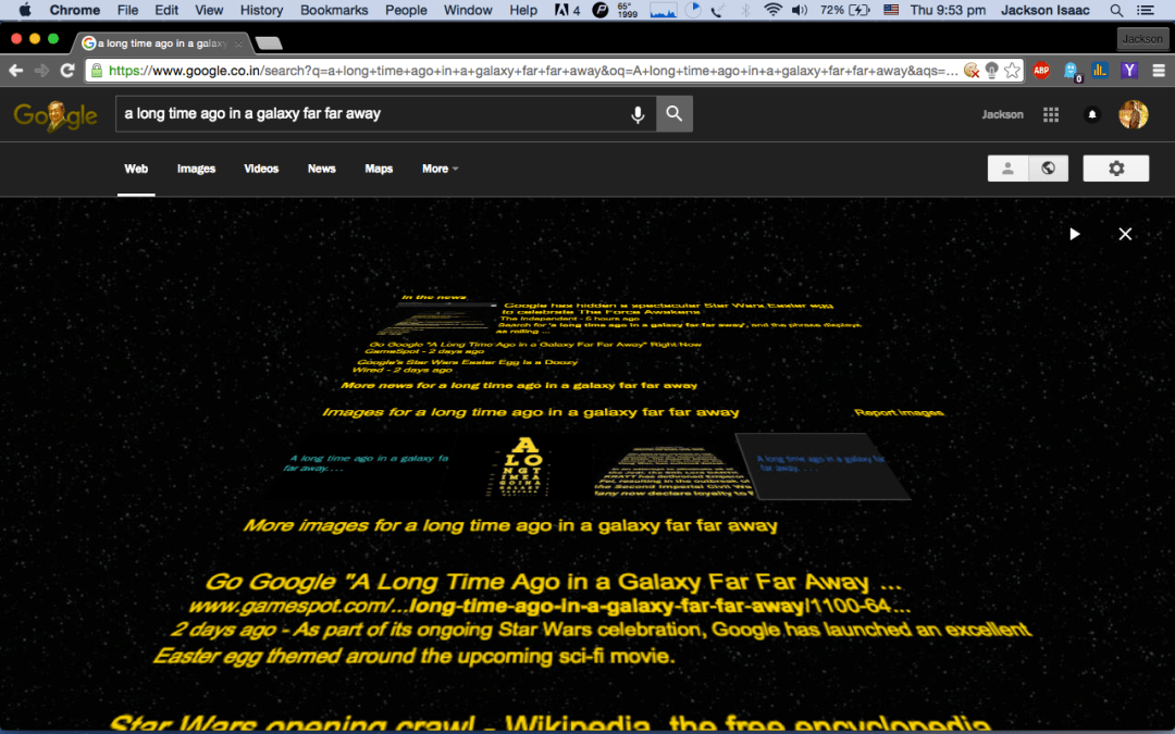 नमस्ते Google has an awesome treat for all the Star Wars fans 🙂 Open up Google Chrome and enter the following query in URL bar - "a long time ago in a galaxy far far away" and see the magic. Here's a small preview of the page if you the Easter egg isn't available. May … Continue reading [Star Wars] Google Easter Egg